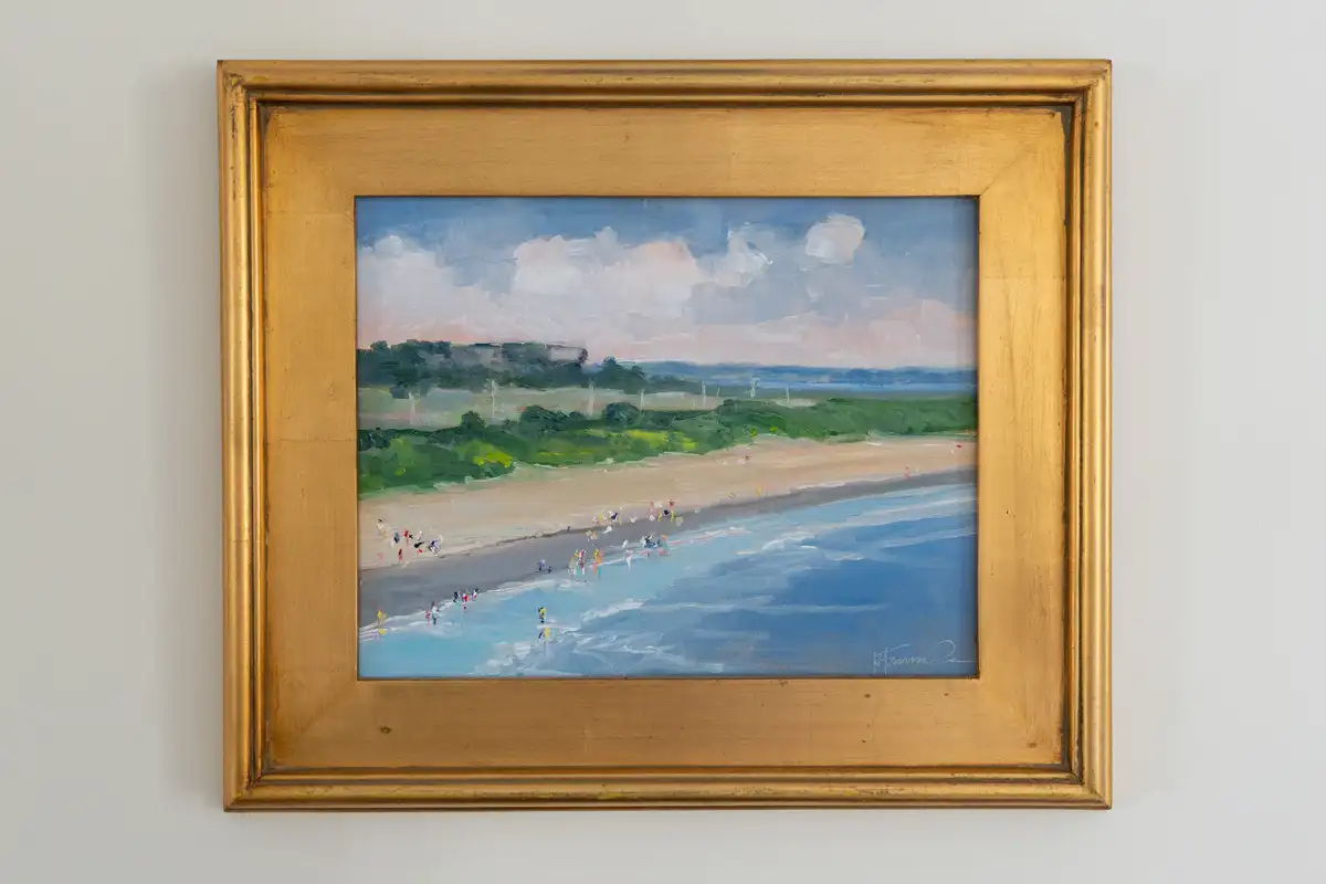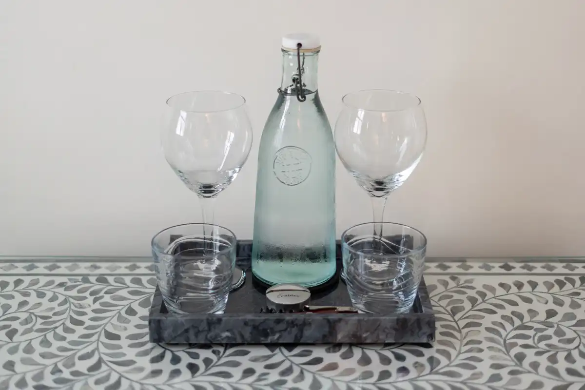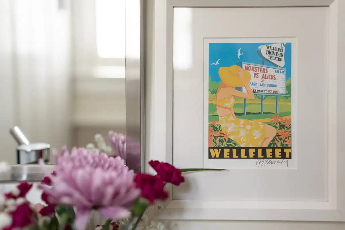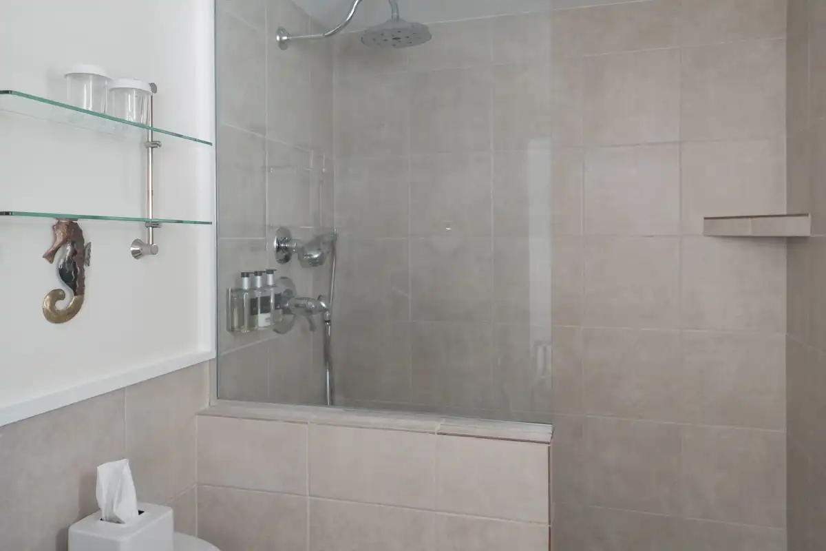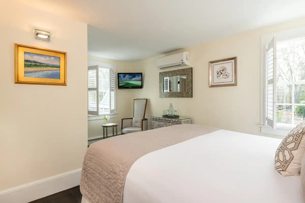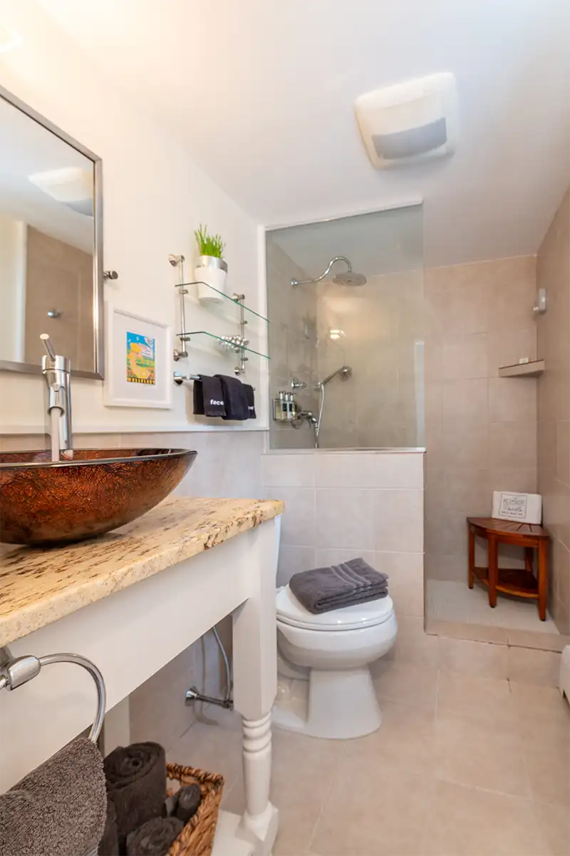 Cozy Queen Room #5 at Platinum Pebble offers an intimate and thoughtfully designed space. Situated on the second floor, this corner room faces south and west, providing a charming view over the pool and gardens. It features a queen-size bed with a Kingsdown mattress, one armchair, a small side table, a bureau, and a small closet. The private bathroom has a walk-in glass and tile shower. The bedroom is approximately 188 sq ft and includes the 42 sq. ft. bathroom.