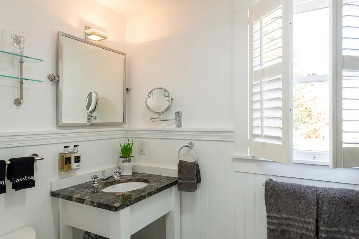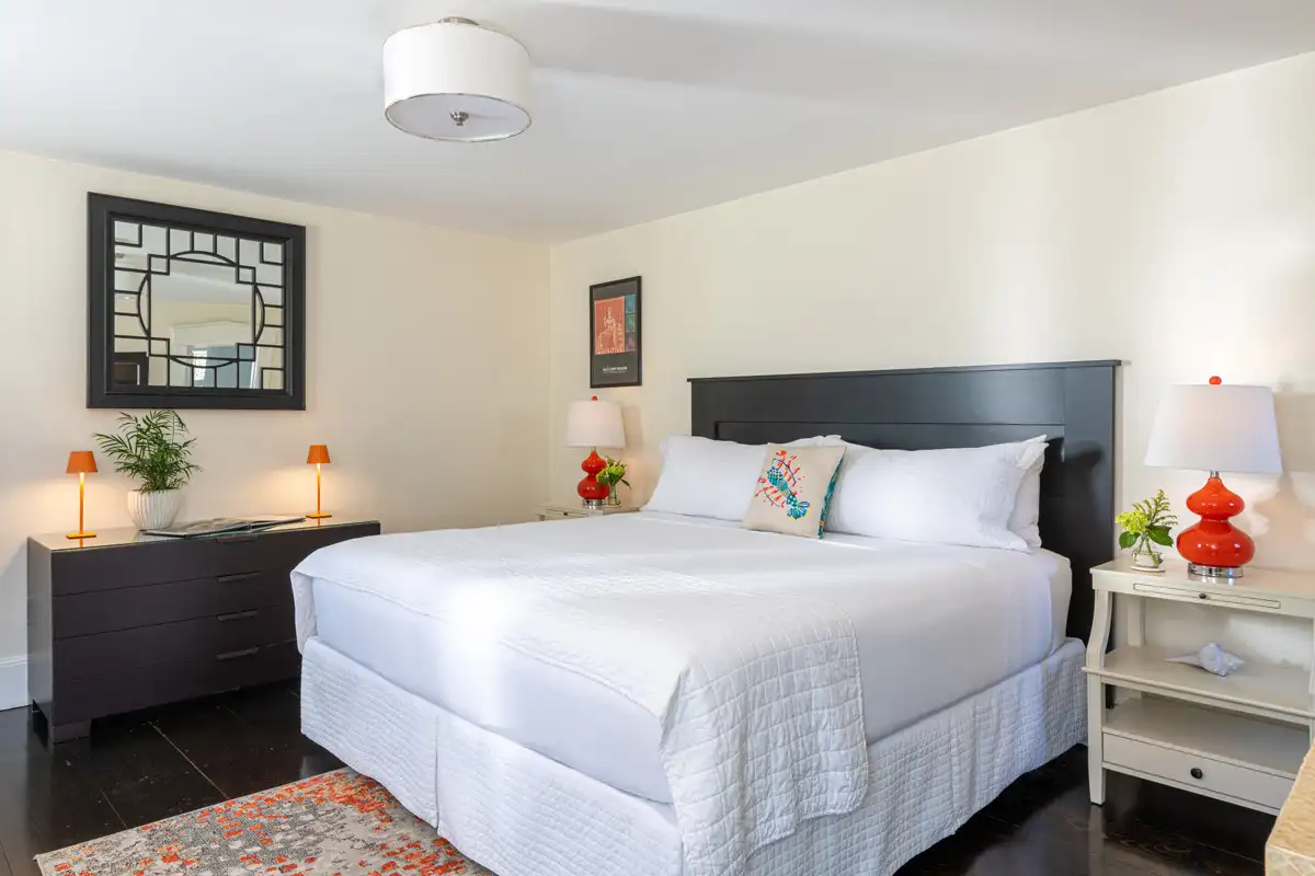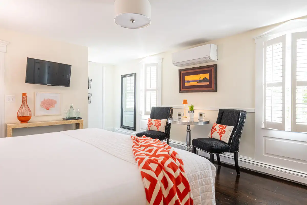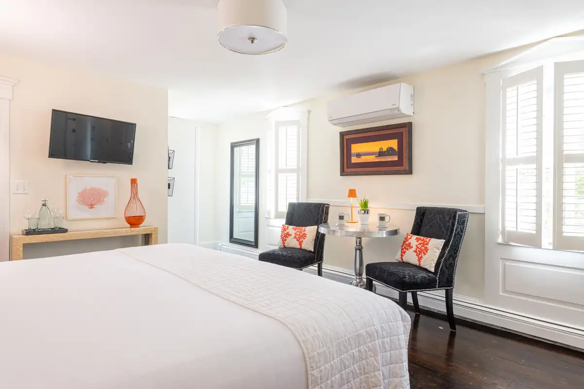 Deluxe King Room #2 at Platinum Pebble offers a spacious and thoughtfully designed retreat. Situated on the first floor, just off to the right of the main entry, this corner room faces east and is filled with natural morning light. You will find ample storage, with both a wardrobe and a bureau, and the room also features a table with two chairs. The private bathroom includes a generous walk-in glass and tile shower with both a rain shower head and an adjustable shower head. The bedroom size is approximately 229 sq. ft. and consists of a 44 sq. ft. bathroom.