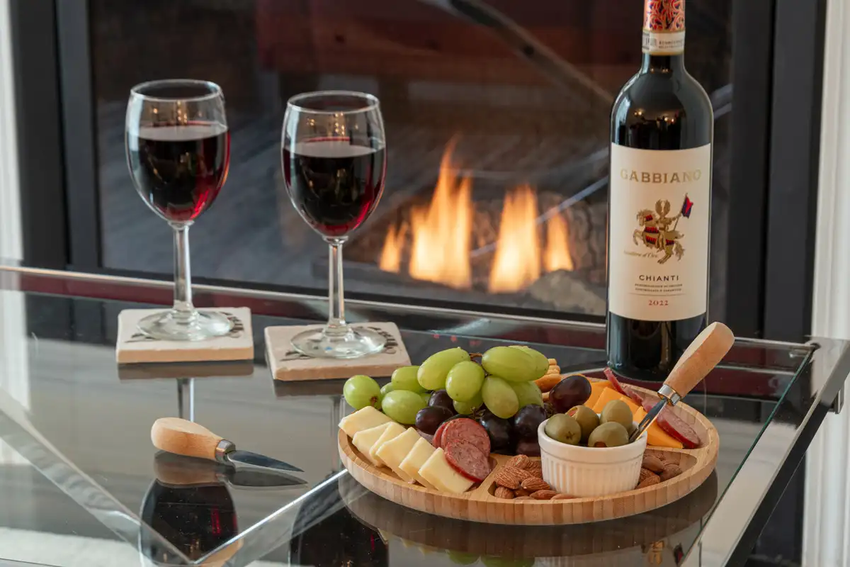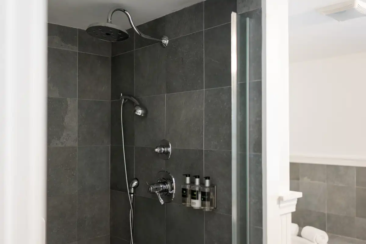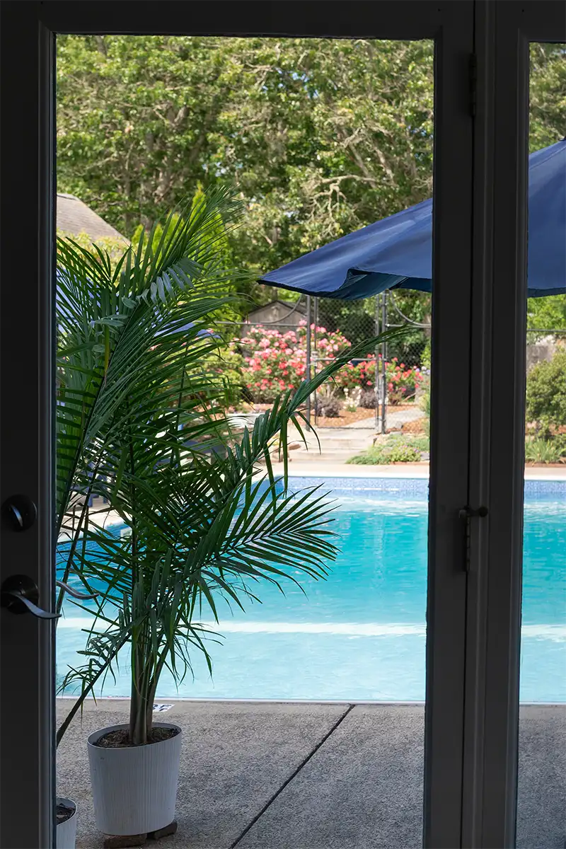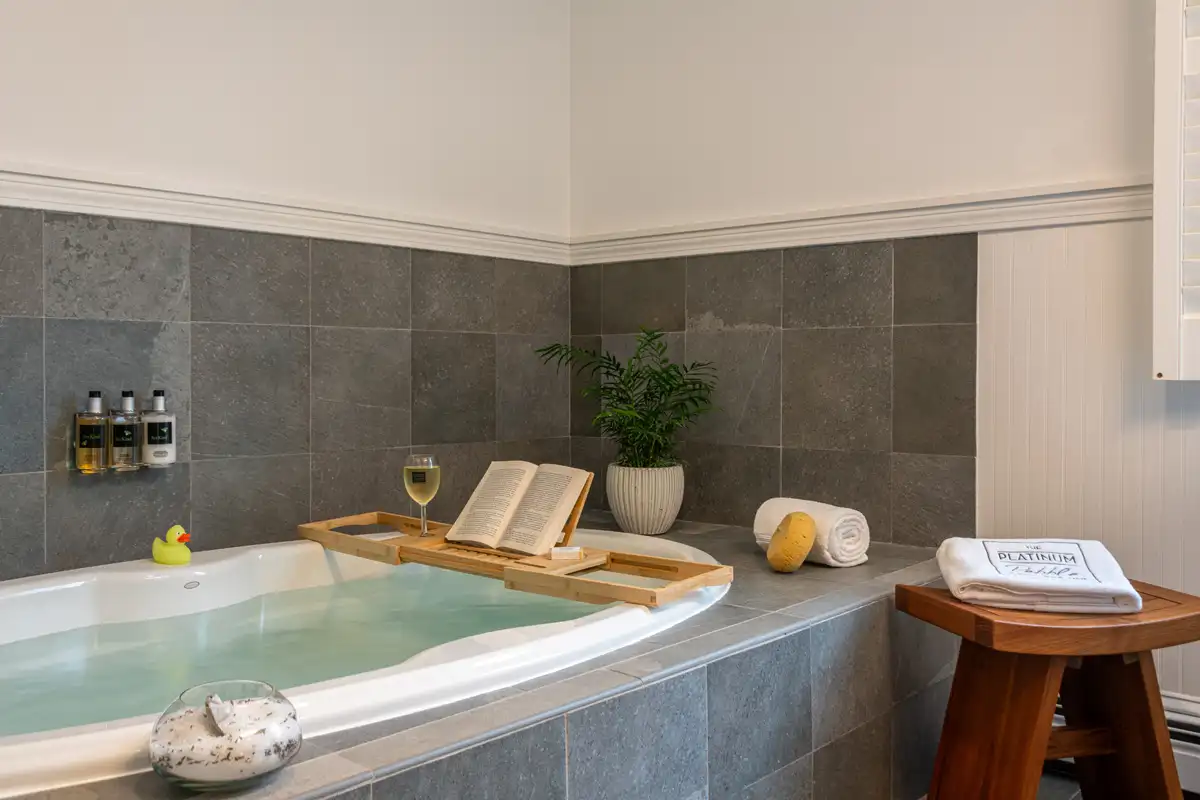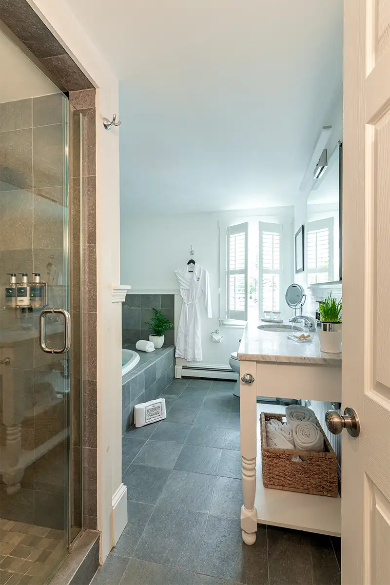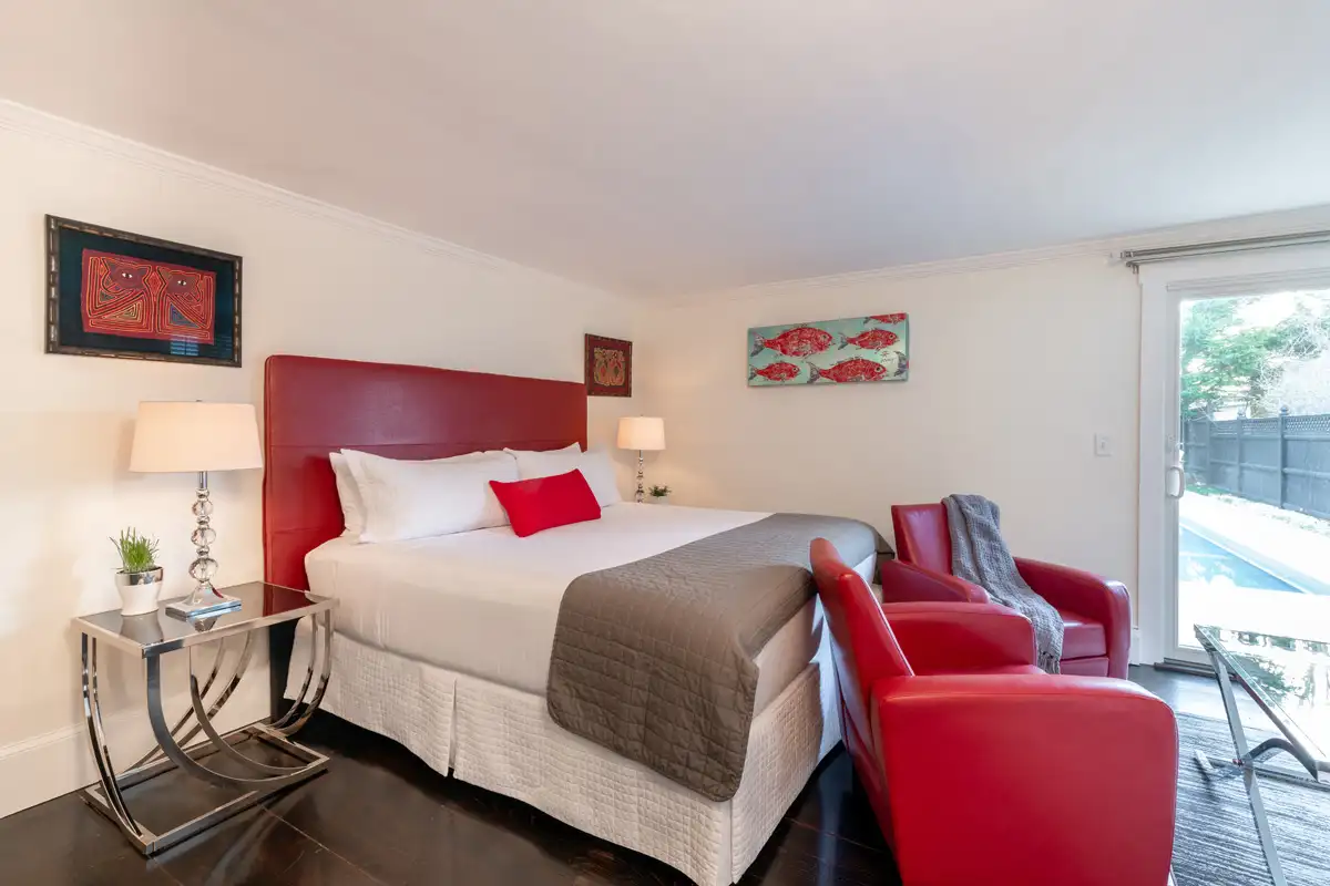 Luxury King Room #1 at Platinum Pebble provides an inviting and relaxing escape. Located conveniently on the first floor, this spacious room features two leather armchairs facing a cozy gas fireplace, and the king-size bed is accompanied by a supportive Verlo mattress. The luxurious bathroom is the only room in the main inn building with both an oversized soaking tub and a walk-in shower equipped with a rain shower head and an adjustable shower head. Sliding glass doors face the west and open onto a peaceful poolside terrace, perfect for enjoying breakfast outdoors. The dry bar has a mini-fridge as well as in-room coffee & tea service, so everything you need is at your fingertips. The bedroom is approximately 278 sq ft and includes a 5′ closet and a 108 sq. ft. bathroom.