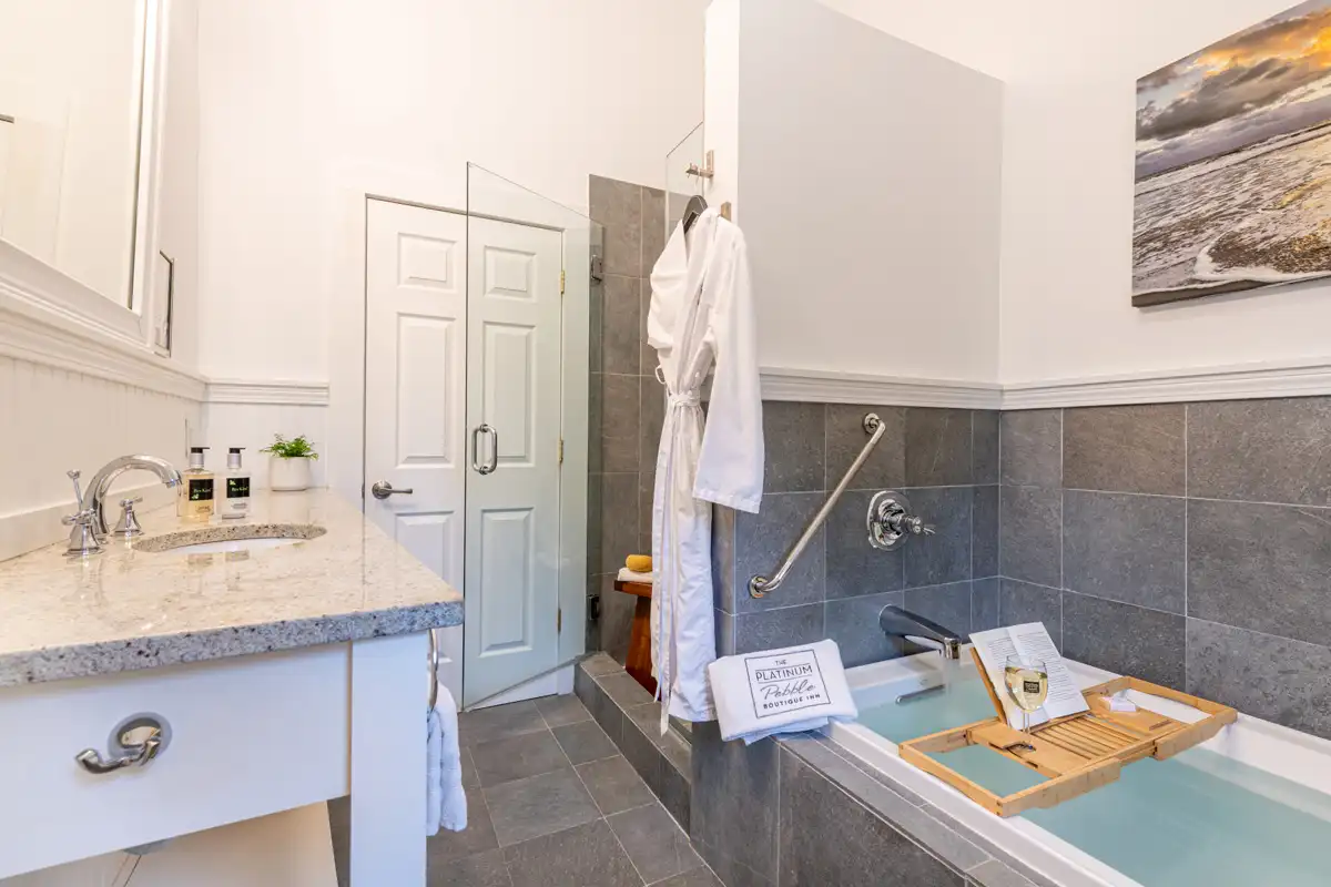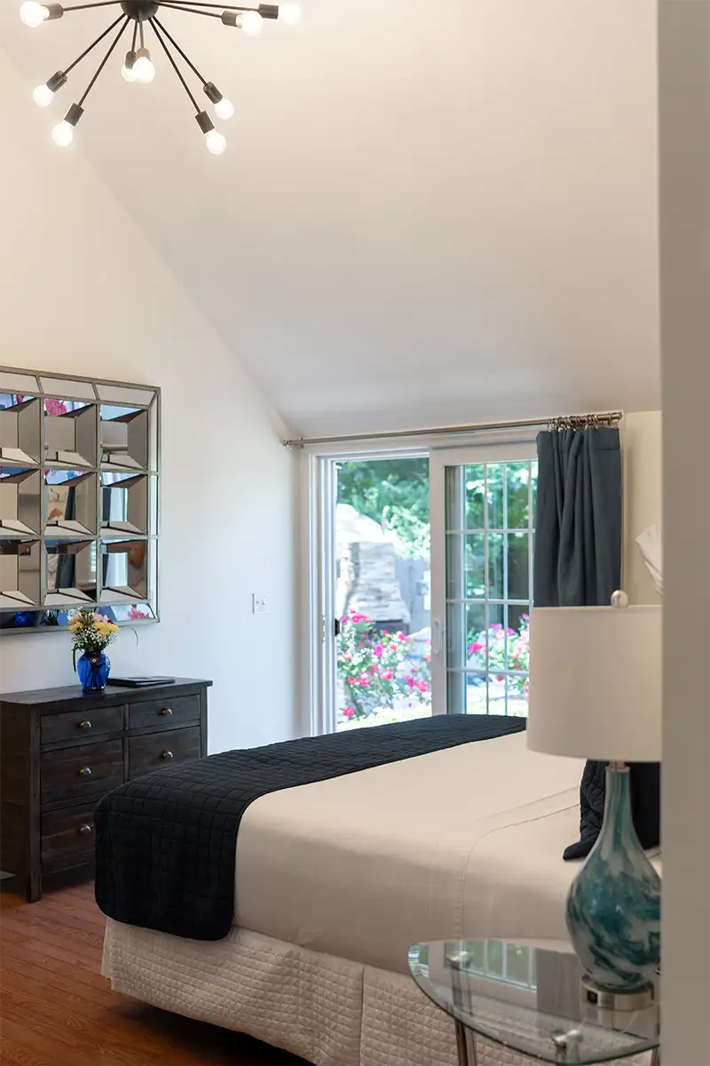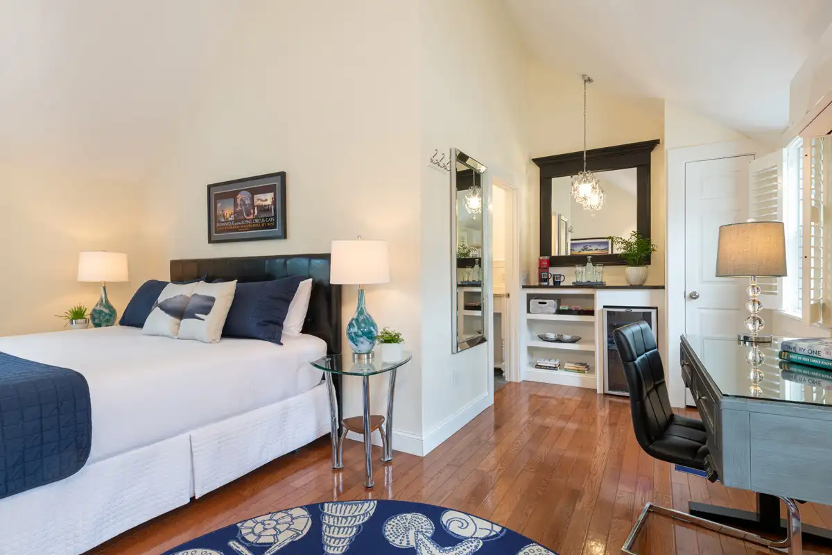 Luxury King Room #8 is one of the two guest rooms located in the carriage house, situated just past the pool area. It offers a private retreat and spacious accommodations. This inviting room features vaulted ceilings, a sitting area with two chairs in front of a gas fireplace, an ergonomic, adjustable-height desk, and a comfortable king-size bed with a Verlo mattress. There is an alcove with a dry bar, beverage fridge, and in-room coffee/tea service. A small closet and bureau provide storage. The spacious bathroom includes a deep soaking tub and a tile and glass shower. Sliding glass doors lead to your private garden terrace, where you may enjoy breakfast seated among the rose bushes. The bedroom size is approximately 360 sq. ft. and includes the 90 sq. ft. bathroom.