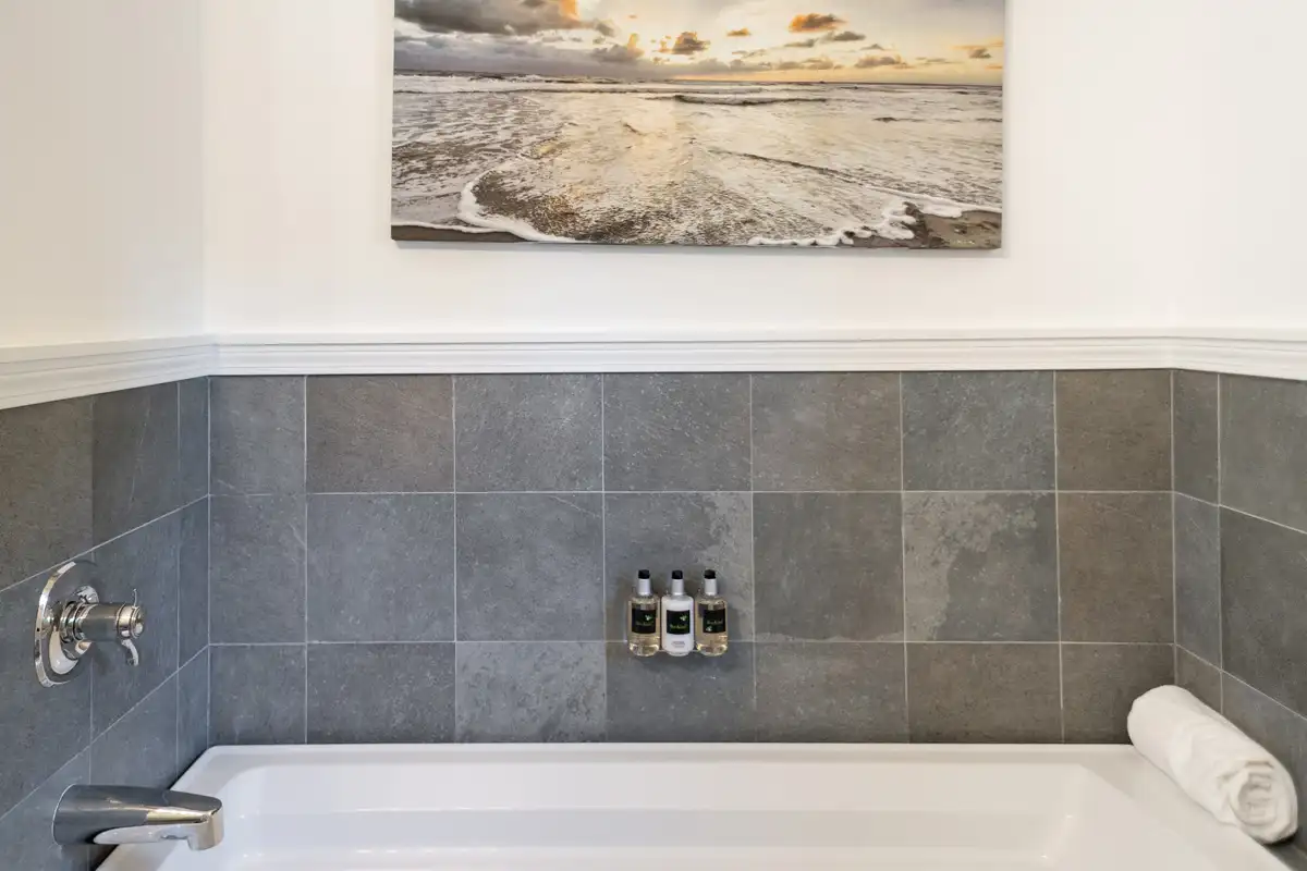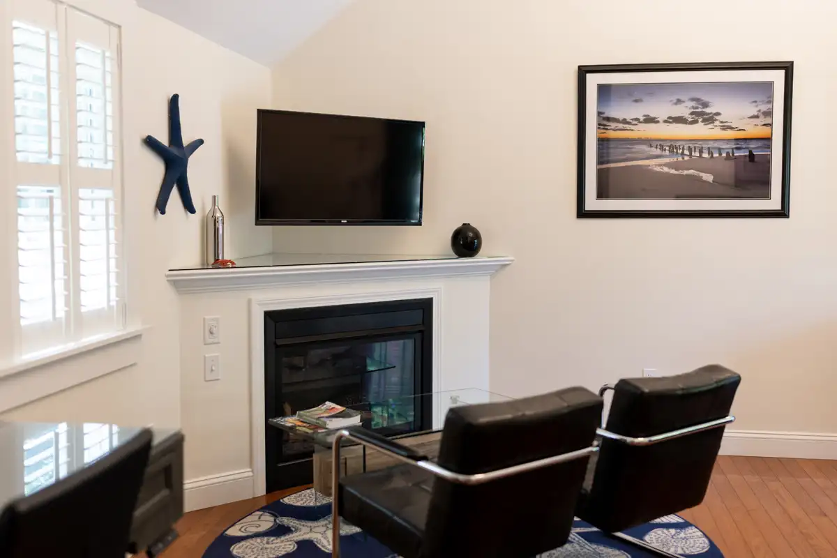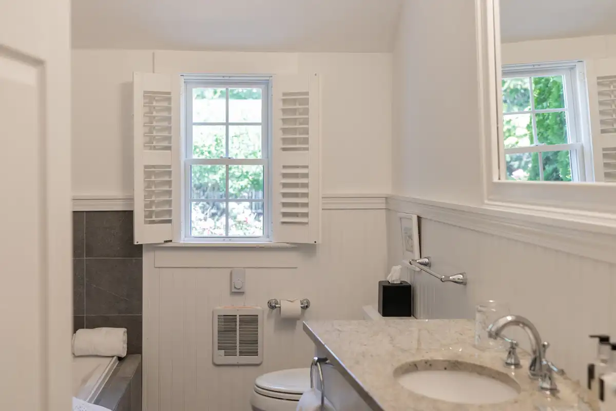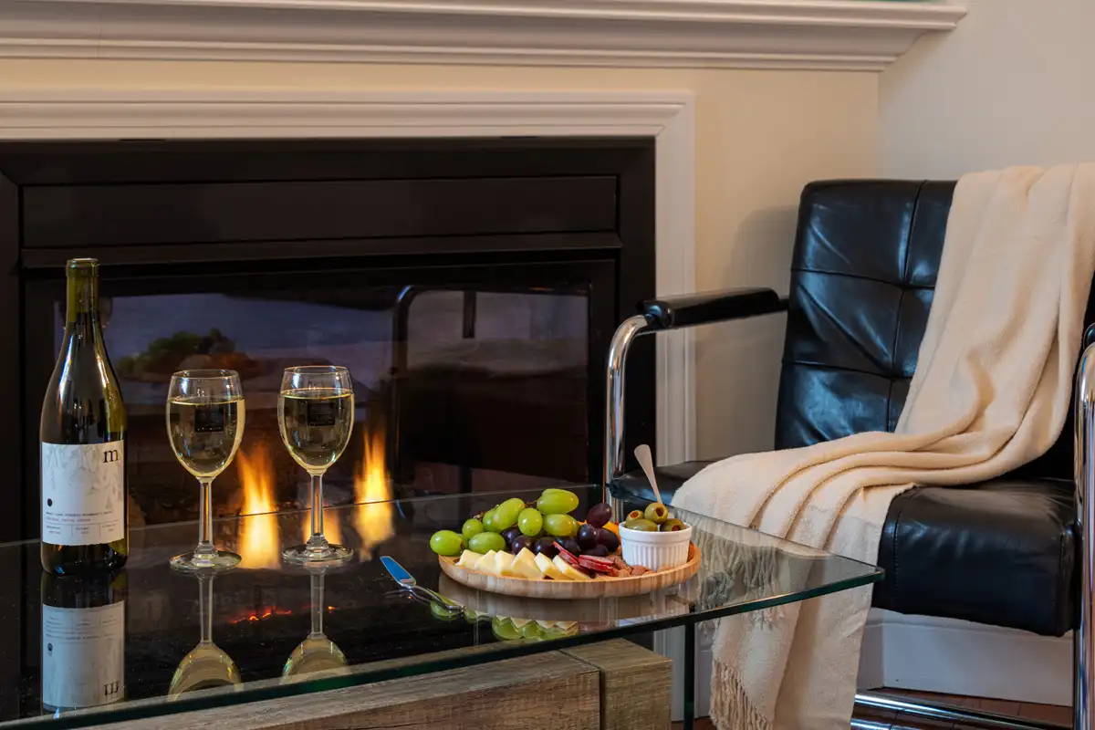 Luxury King Room #8 is one of the two guest rooms located in the carriage house, situated just past the pool area. It offers a private retreat and spacious accommodations. This inviting room features vaulted ceilings, a sitting area with two chairs in front of a gas fireplace, an ergonomic, adjustable-height desk, and a comfortable king-size bed with a Verlo mattress. There is an alcove with a dry bar, beverage fridge, and in-room coffee/tea service. A small closet and bureau provide storage. The spacious bathroom includes a deep soaking tub and a tile and glass shower. Sliding glass doors lead to your private garden terrace, where you may enjoy breakfast seated among the rose bushes. The bedroom size is approximately 360 sq. ft. and includes the 90 sq. ft. bathroom.