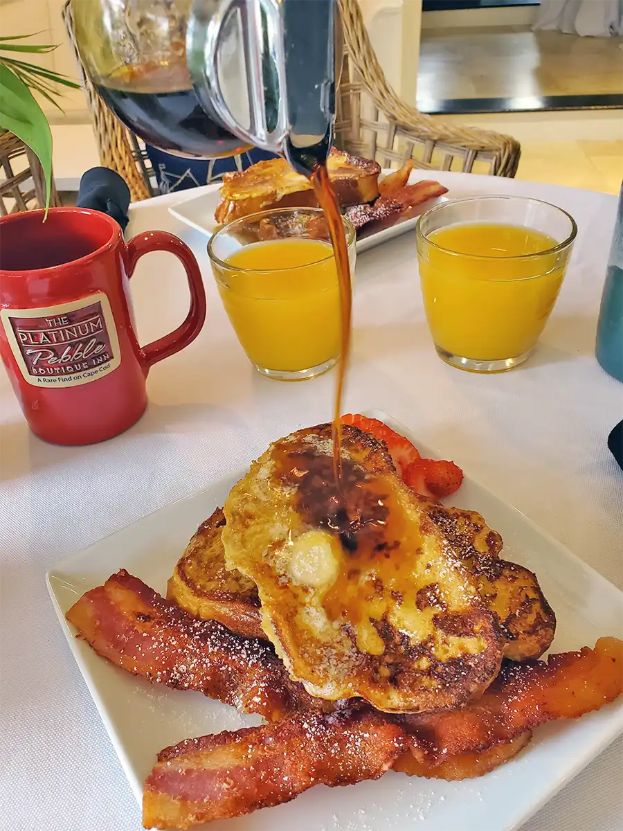 Food lovers, your Cape Cod breakfast adventure starts here at Platinum Pebble. Each morning, a gourmet breakfast awaits, crafted by our Chef who is also your Innkeeper. The menu changes daily, and there are options for just about every dietary restriction, so every breakfast feels special. Choose to dine in the Pool Lounge, the Platinum Cafe, in the garden shade, or by the pool.